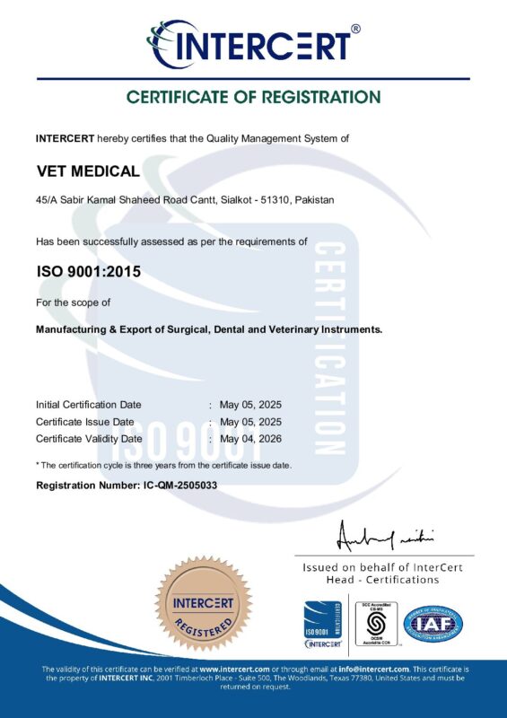 Vet Medical is an ISO 9001:2015 certified leading manufacturer of veterinary medical instruments.